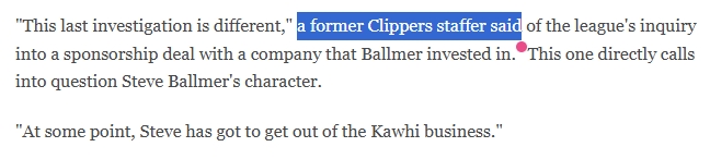 Một cựu nhân viên của Clippers nói: "Lần này (cuộc điều tra giải đấu) khác với trước đây và lần này nó đặt câu hỏi trực tiếp cho nhân vật Ballmer. Một ngày nào đó, Ballmer phải cắt theo Leonard."