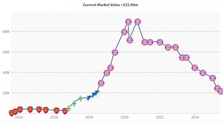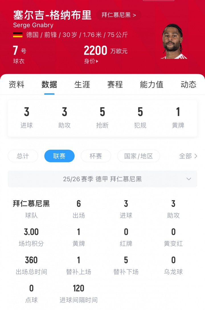 Giá trị tài sản ròng cao nhất là 90 triệu! Gnabry 30 tuổi chuyển sang chơi ở vị trí tiền vệ tấn công và có được sức sống mới. Anh ghi 6 bàn sau 6 vòng ở mùa giải mới.